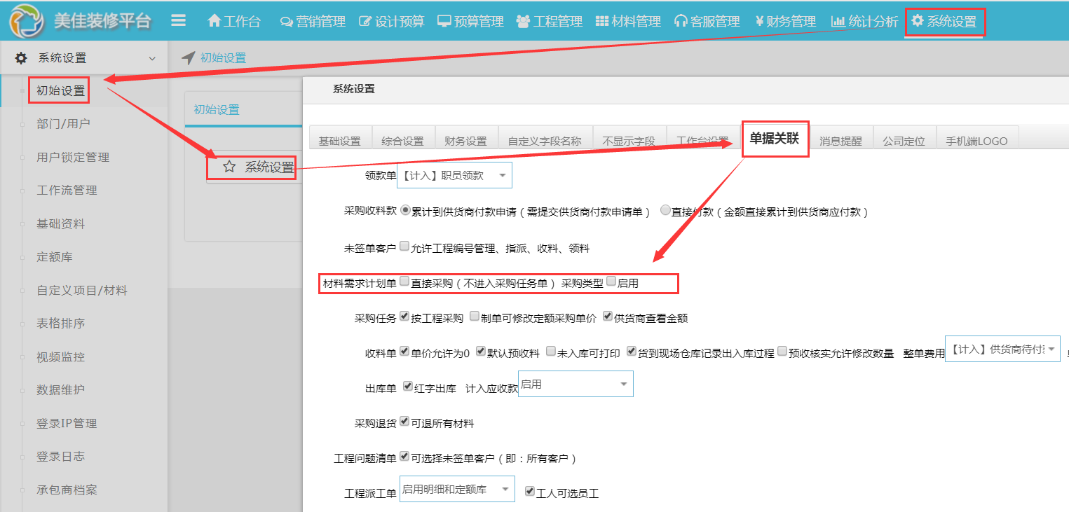 依次點(diǎn)擊系統(tǒng)設(shè)置---初始設(shè)置--系統(tǒng)設(shè)置---單據(jù)關(guān)聯(lián)【取消直接采購(不進(jìn)入采購任務(wù)單)】