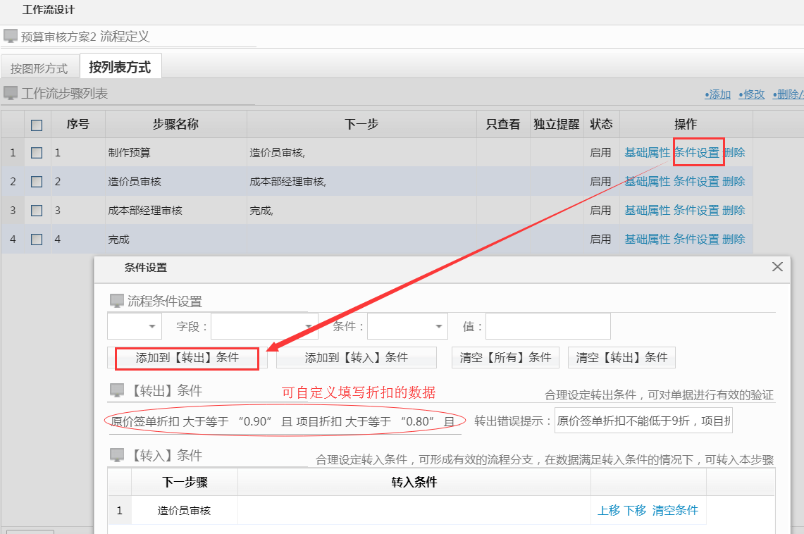工作流中選擇按具體數據進行折扣的設置完成轉入的操作