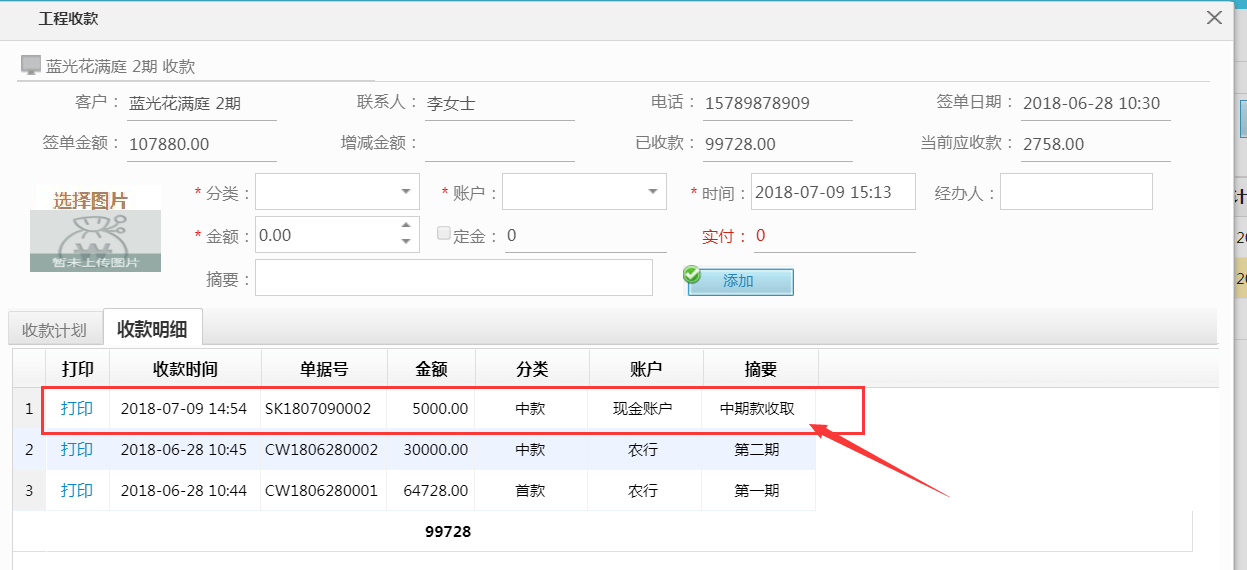 完成收款單的操作此數據會自動關聯到財務管理的工程收款形成收款明細