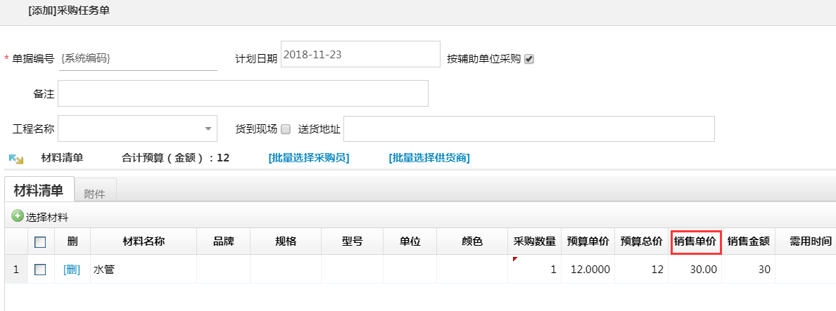 材料進銷存對于一個公司來說除了是采購員負(fù)責(zé)的一項工作之外,他還是連接著工程成本的一個重要憑證。對于價格來說是老板和采購員比較重視的一個環(huán)節(jié),近期美佳根據(jù)客戶反饋的需求,采購任務(wù)單下單的環(huán)節(jié)中將材料的銷售價可直接顯示出來供采購員參考。這樣不僅僅只是查看材料成本價也能查看材料銷售價,給采購人員更多的參考價格。