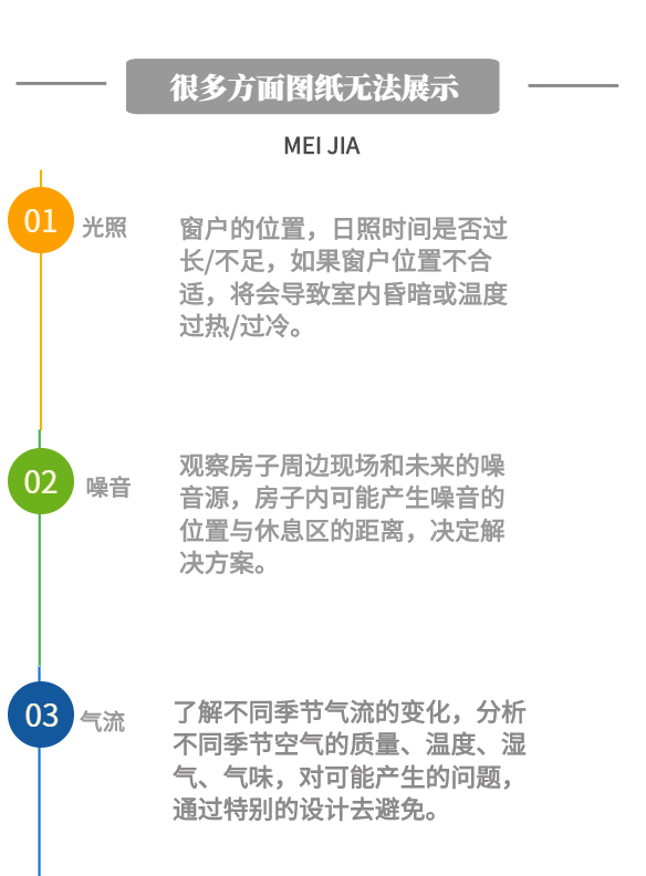 有很多東西是圖紙上無法體現的,因為房屋采光/朝向如何、是否存在噪音、周圍的環境狀況等等只能通過現場才能觀察到,有一些不好的因素可以通過設計來適當規避。