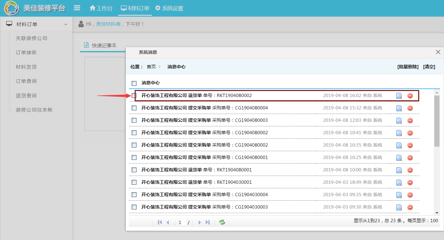 美佳裝飾管理軟件,集裝修公司、材料商于一體的信息化管理平臺,不斷在完善各種功能,滿足裝修公司的所有個性化需求,近期新增材料商退貨查詢、退貨消息通知。以達到材料商與裝修公司的溝通零等待,避免錯漏信息。