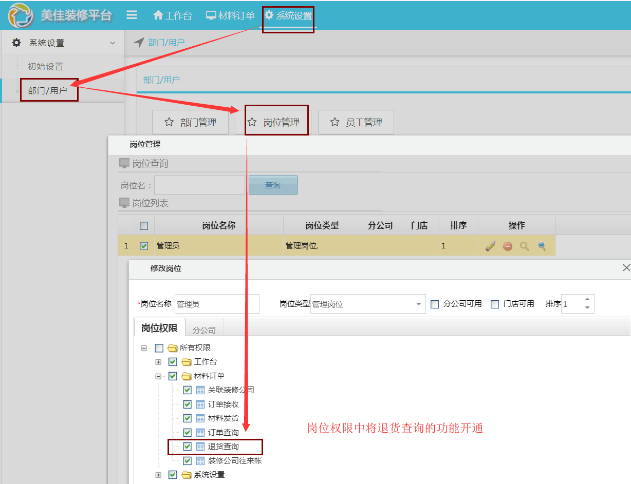 1、首先在【系統設置】—【部門/用戶】—【崗位管理】中勾選退貨查詢的選項,打開崗位此項權限之后該崗位就能接收到通知。