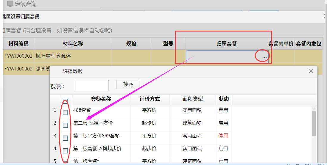 2:在彈出的新界面歸屬套餐下將選中的材料可手動選擇多個套餐