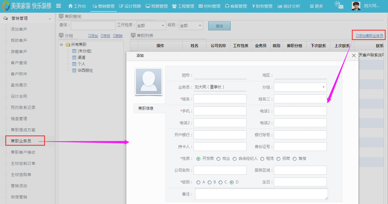 合作伙伴作為裝修公司的編外人員,一般是由本公司的業務員來跟進,近期優化了兼職業務員的相關功能,更多強大的功能盡在美佳。