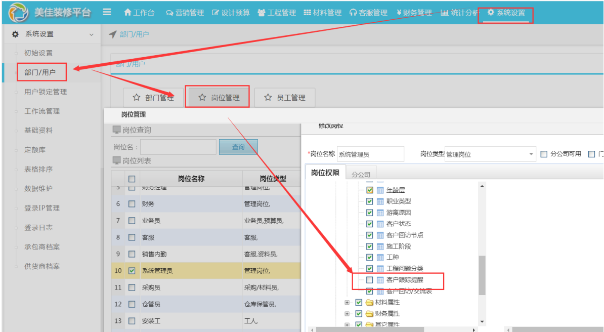第一步:在崗位權限中勾選客戶跟蹤提醒,完善權限設置