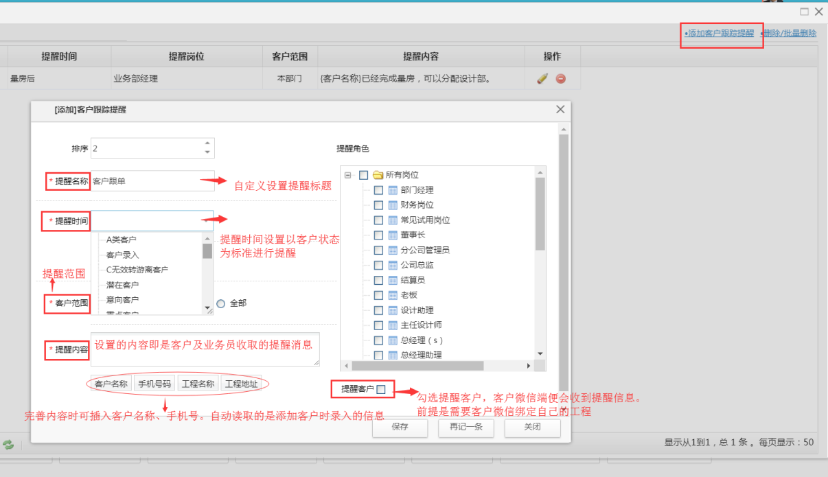 第三步:在添加客戶跟蹤提醒時,可根據設置內容完成相應的信息填寫,設置完成后相關崗位