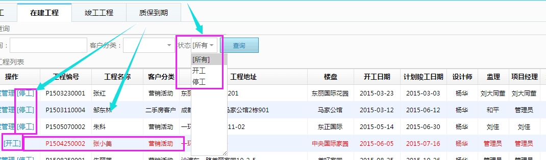 美佳云裝ERP針對工期問題新增了【工程開工/停工】設置,當然啦,也可按開工或停工狀態來區分單獨查詢。要了解工地開工/停工情況,紅色就是停工的,黑色就是正在施工的,打開軟件一目了然。方便管理人員深入分析及時制定應對方案。