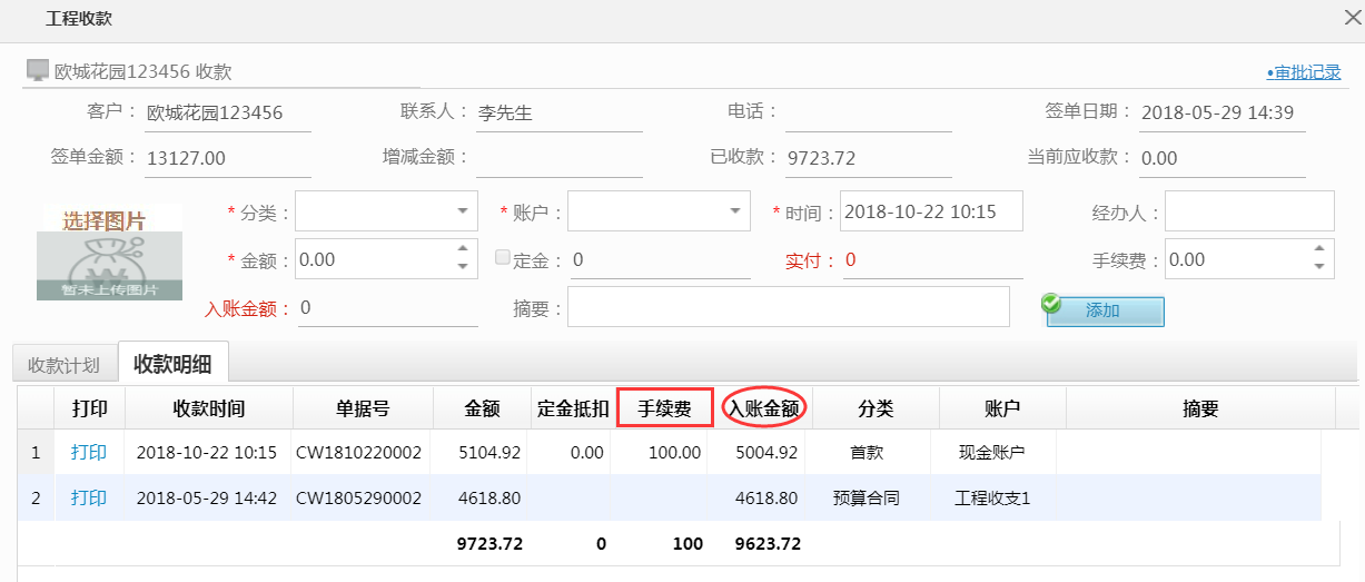 資金回籠是一個公司的首重之重,對于收款的各個名目管理也是讓人抓破頭皮,管理明細賬的冗雜也是讓人很無力,近期美佳技術人員在搜集各位客戶的需求時針對這一現象優化了工程收款相關明細。在收款界面新增手續費,扣除手續費后直接生成入賬金額。具體操作如下所示: