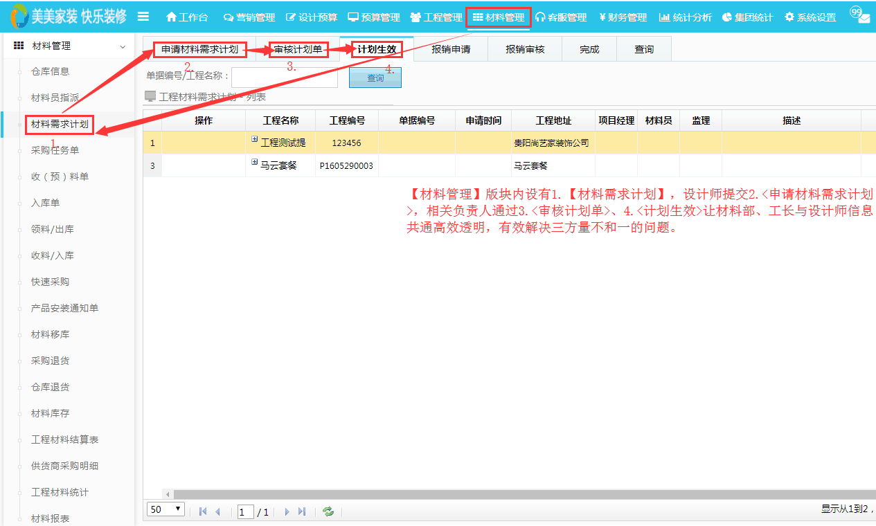 美佳云裝系統(tǒng)優(yōu)化了對(duì)材料的管控,部門與部門之間實(shí)現(xiàn)精準(zhǔn)高效的信息互通,保證了項(xiàng)目順暢無誤的進(jìn)行。從源頭上保證了客戶的滿意度。設(shè)計(jì)師先提交<申請(qǐng)材料計(jì)劃>,相關(guān)負(fù)責(zé)人通過<審核計(jì)劃單>之后,<計(jì)劃生效>信息共通,保證預(yù)算量、結(jié)算量和開單量的三量合一。整個(gè)流程在系統(tǒng)內(nèi)就可以精確的溝通傳達(dá)并完成,大大的提高了工作效率,縮短了復(fù)雜的申報(bào)過程,審核時(shí)間。